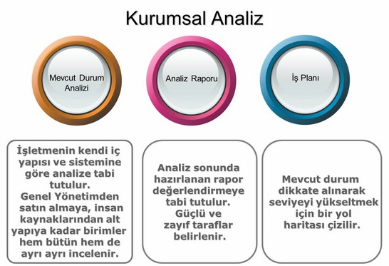 Kurumlar ile gerçekleştirilecek olan kurumsal gelişim yolculuğunda yol haritasının ihtiyaca uygun hazırlanması ve sürecin doğru yönetilmesi için kurumların mevcut konumu ile gelecekte olmak istedikleri konumun doğru tespit edilip, aradaki farkın iyi saptanmış olması gerekir. Bu gereklilikler “Kurumsal Analiz”de gerçekleştirilen çalışmalar ile yerine getirilmekte ve çalışmaların çıktıları diğer aşamalara girdi sağlayarak birbirleriyle ilişkilerini kurmakta, böylelikle bütünleşik bir sistemin oluşturulmasını desteklemektedir.